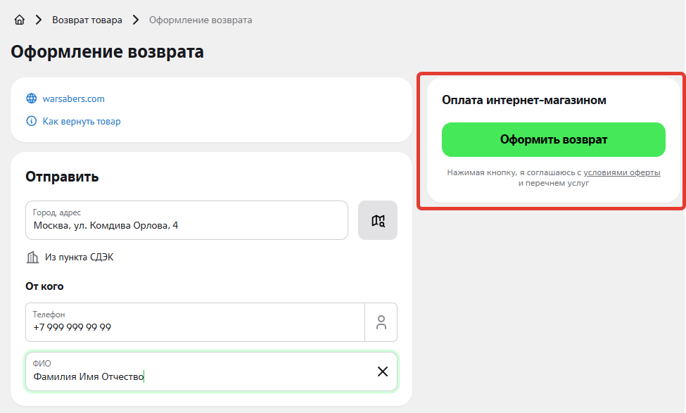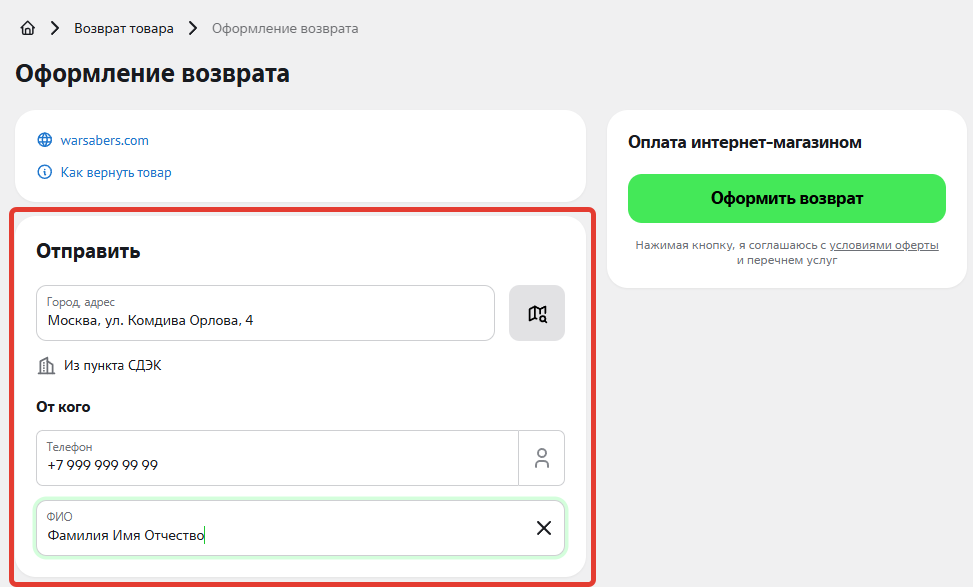 Выберите пункт выдачи СДЭК, удобный для передачи товара на возврат и укажите ФИО и контактный номер телефона отправителя.